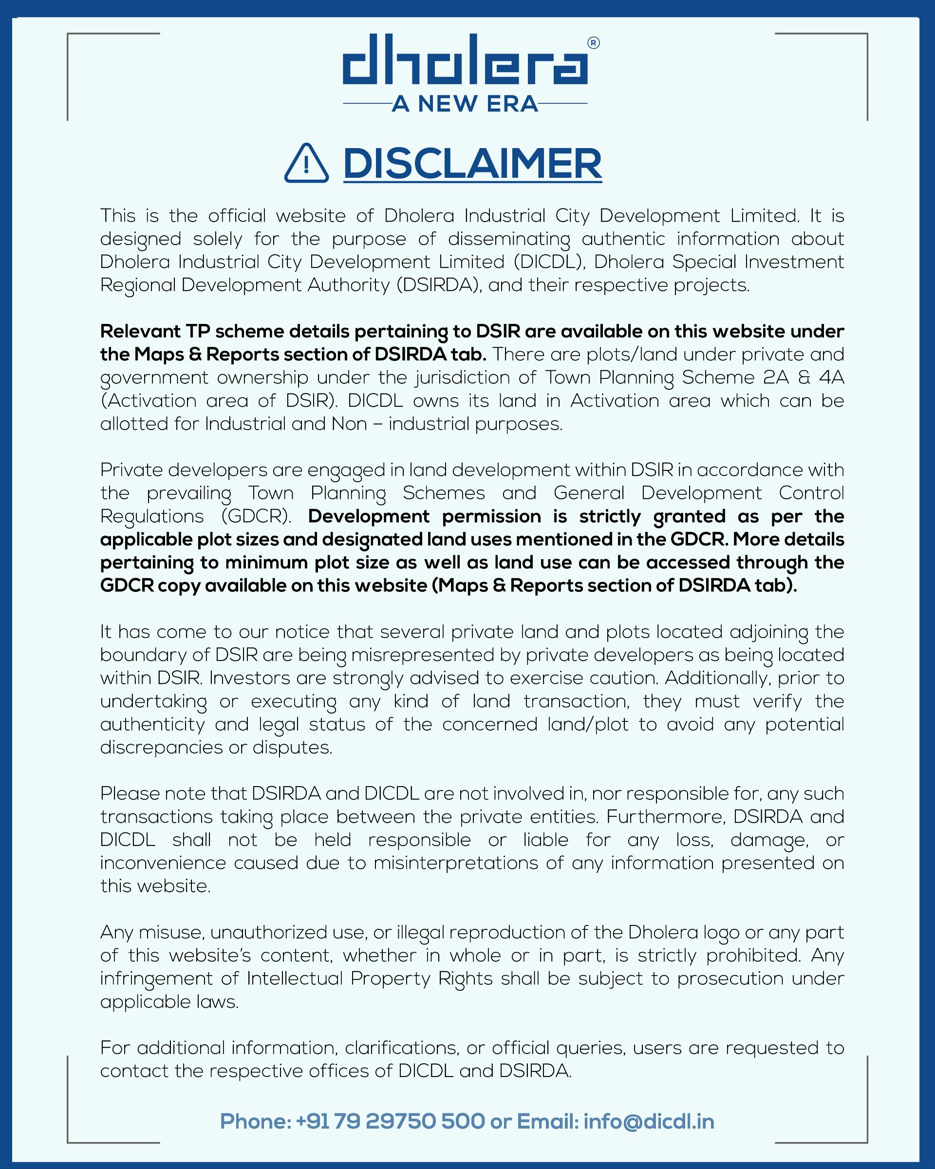 DICDL is responsible for planning, developing, and managing the Dholera Special Investment Region, India’s first greenfield smart industrial city. DICDL oversees the creation of core infrastructure including roads, utilities, and industrial services, along with the allocation of land for various uses. Within the Activation area, DICDL has developed a robust water, power and gas supply network, storm water drainage and effluent treatment facilities to support industrial and urban needs. It also manages city-wide digital monitoring, surveillance and safety systems, ensuring a future-ready, well-governed and sustainably developed industrial ecosystem.